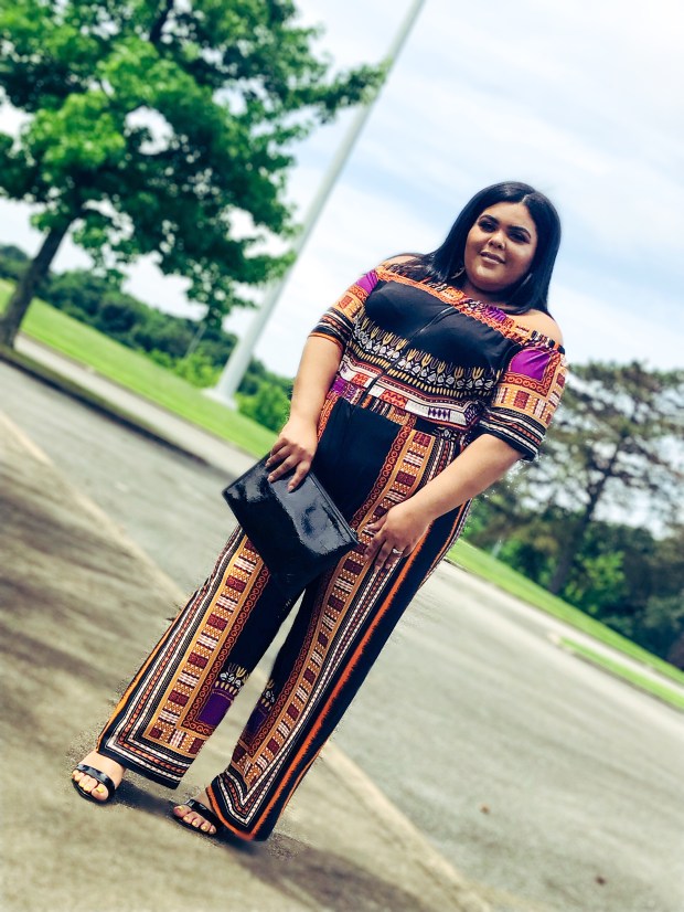 I absolutely love this jumpsuit! The fall colors, the comfy material, and the off the shoulder detail help make it that perfect outfit for transitioning seasons. Because I wanted this look to be wearable for a cooler summer/ warmer fall, I decided to pair it with a pair of black peep toe kitten heels, also from Ashley Stewart.