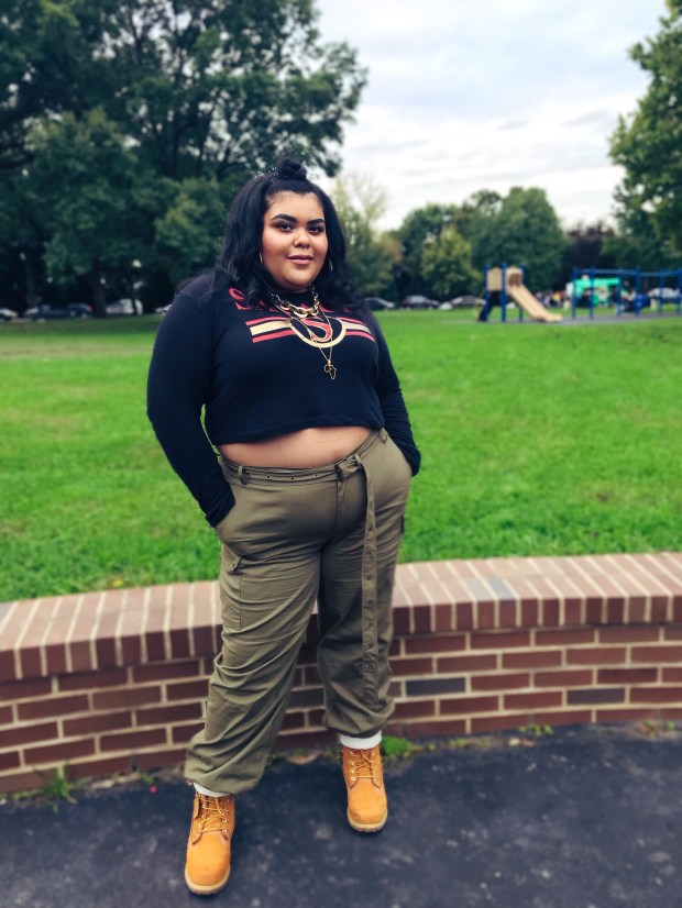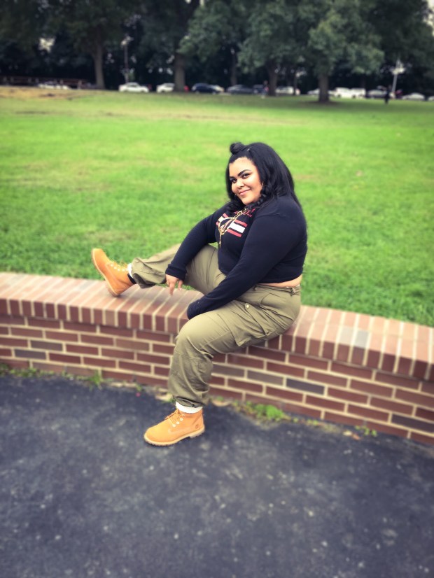 As I was getting ready and finished styling my look for the event, I was feeling myself. I paired the cargos with this super cute crew neck cropped sweatshirt that I purchased last year, also from Fashion Nova. I completed the look with some off white boots socks, classic butter Timbs, and chunky gold jewelry to add a city vibe. GORL! I loved the way my outfit came together, I loved how it fit, and I especially loved that my Kim Possible meets Jenny from the block concept actually came to fruition.